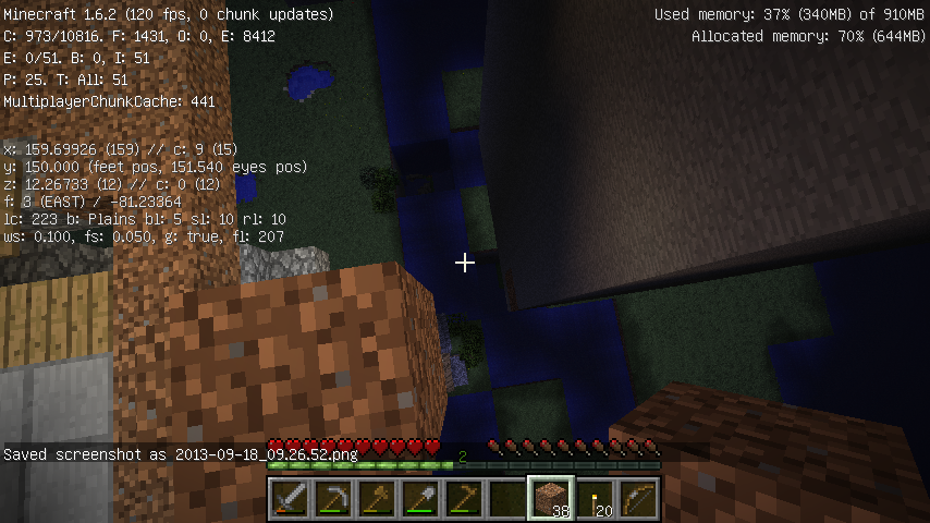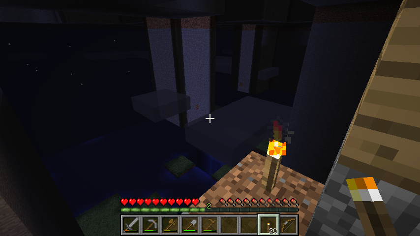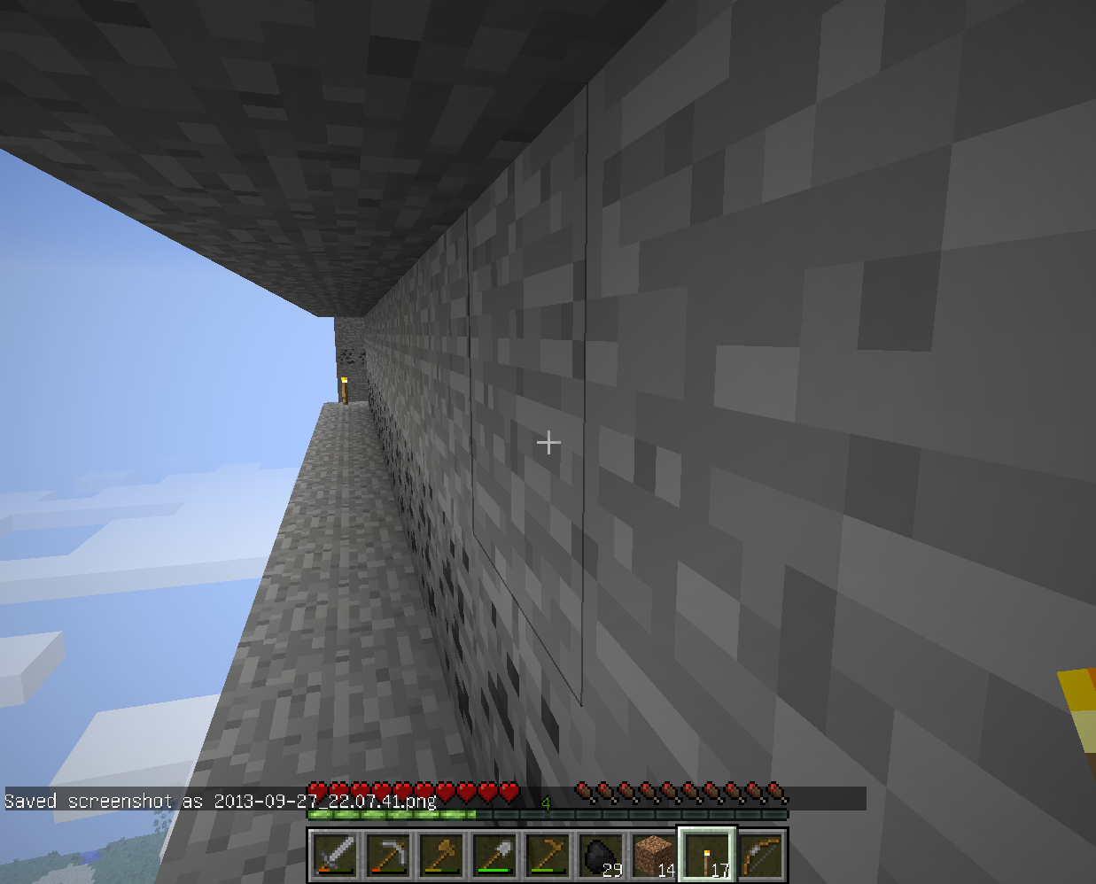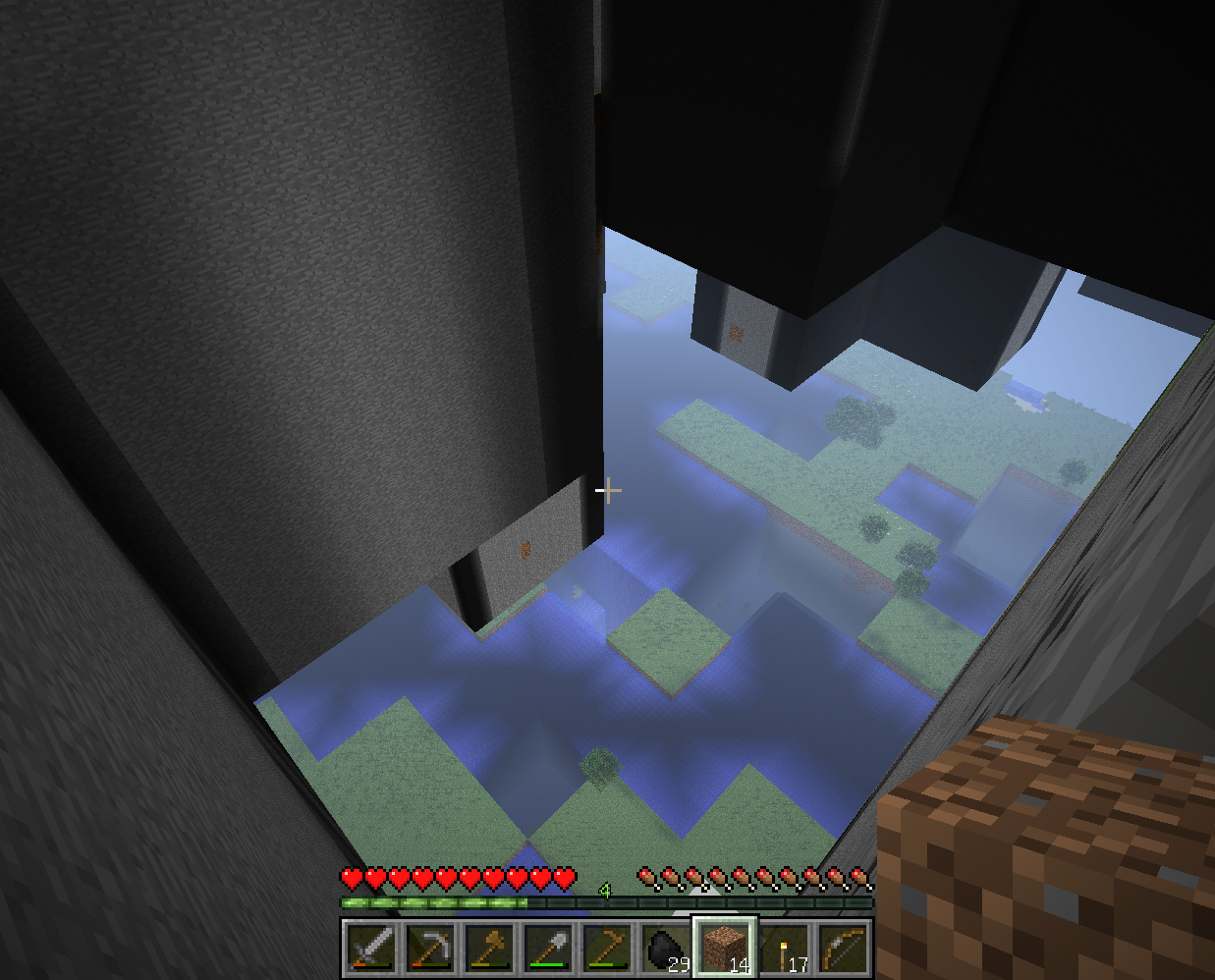 夜になってしまった。 F3で高度を確認。Y=150まできました。 上まではもう少しなので、ここからは石壁を掘って登りましょうか。 で、雲の上。 図らずも出現した石炭の層を掘りつつ移動中です。 先ほどの家は地表から伸びた塔の上に建ってましたが、この辺りはすでに浮遊島の上です。 眼下の様子。 ……下にある土みたいな色のブロックって、もしかしてドアか?www