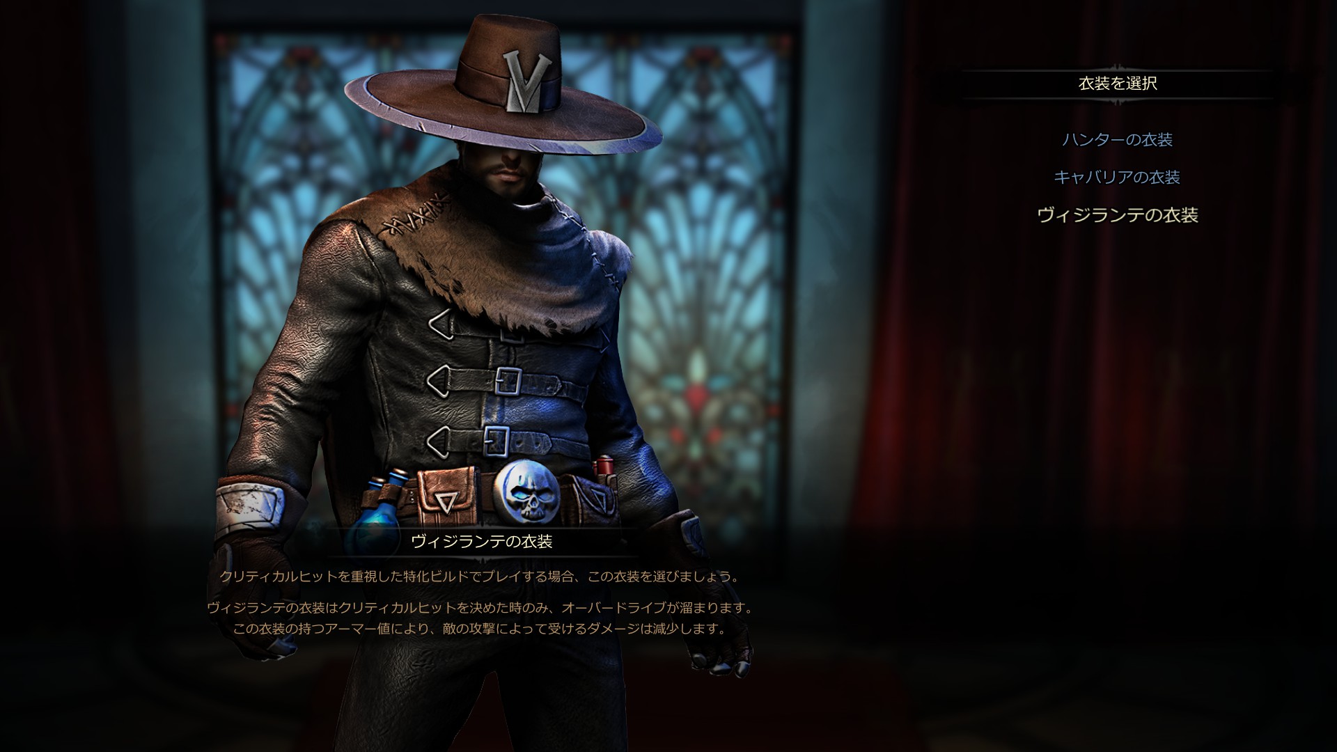 外見はヴィジランテがカッコイイと思うんですが、この衣装次第でオーバードライブの運用がだいぶ変わってくるらしいので、無難なハンター衣装を選択w