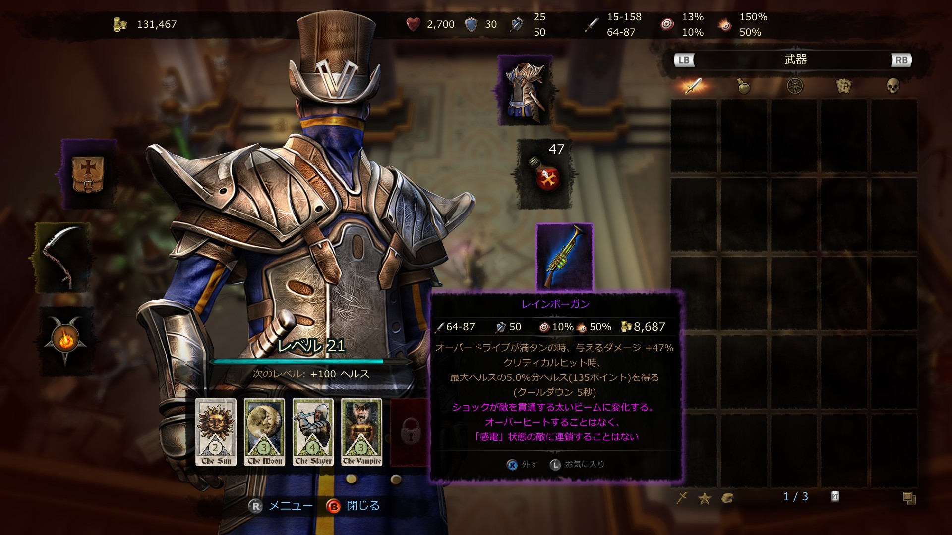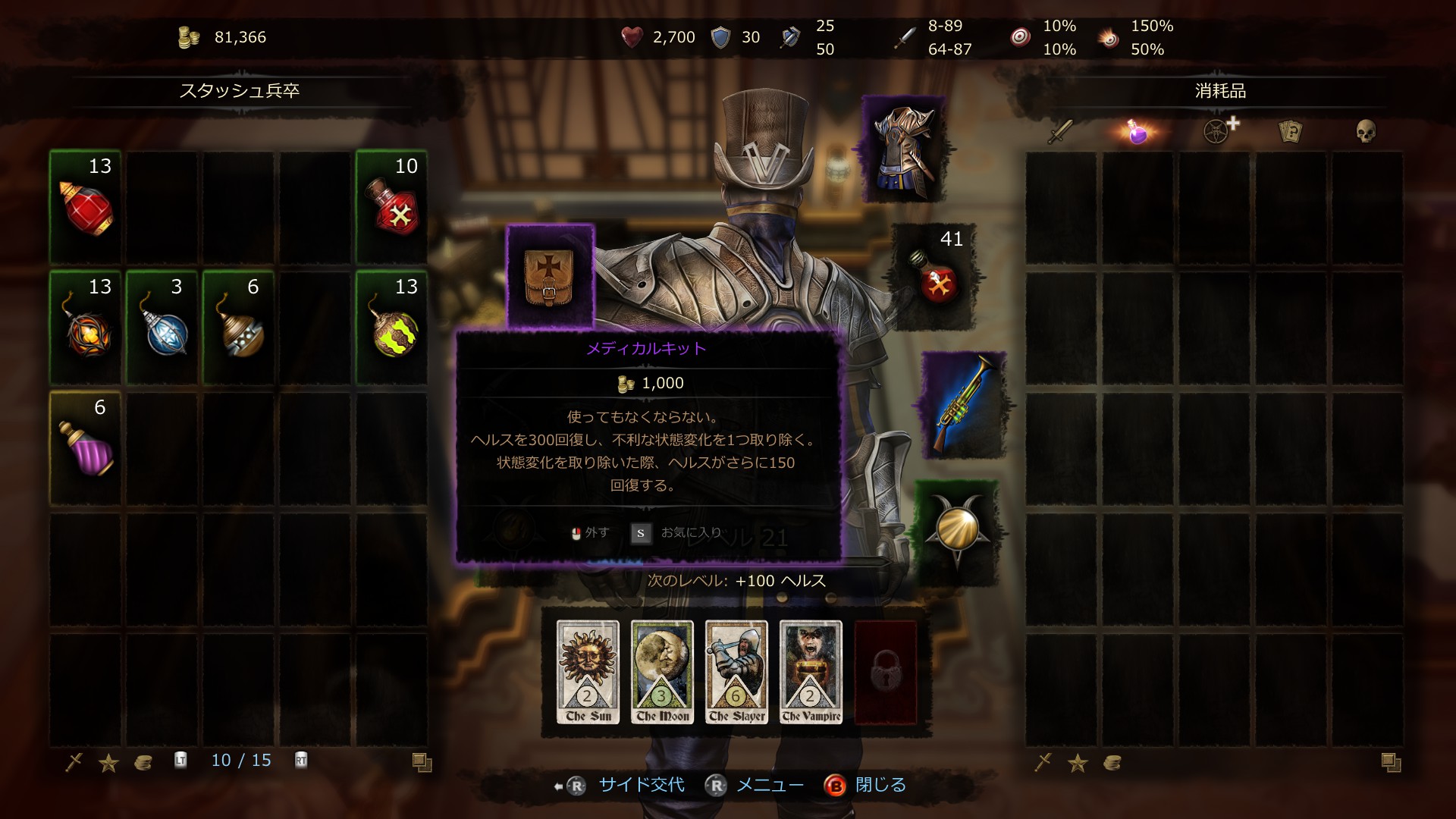 あとはチャレンジに応じて、ポーション祭壇なしならヴァンパイア多めでヘルス回復装備。