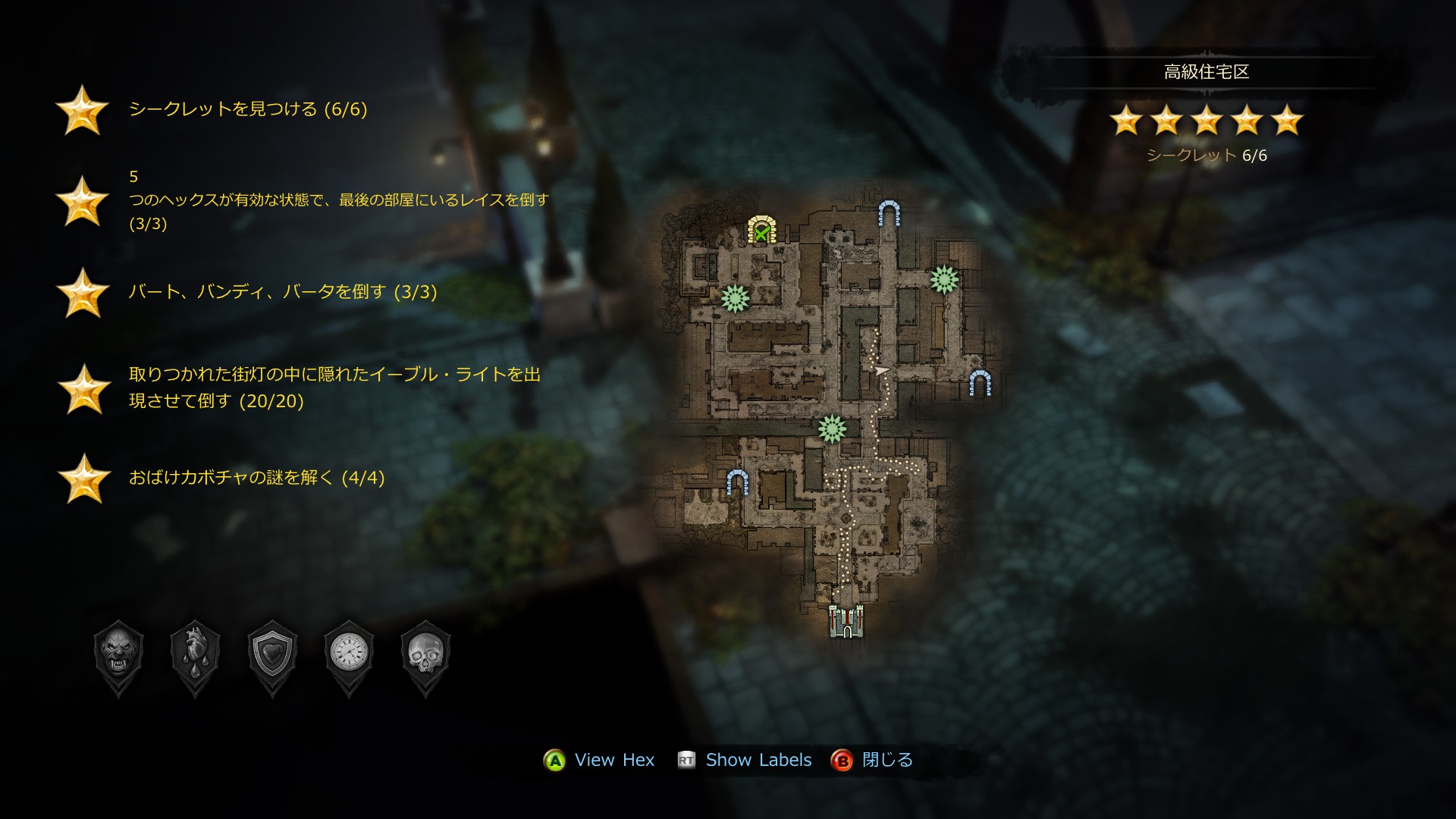 『5つのヘックスが有効な状態で、最後の部屋にいるレイスを倒す』が達成されます。