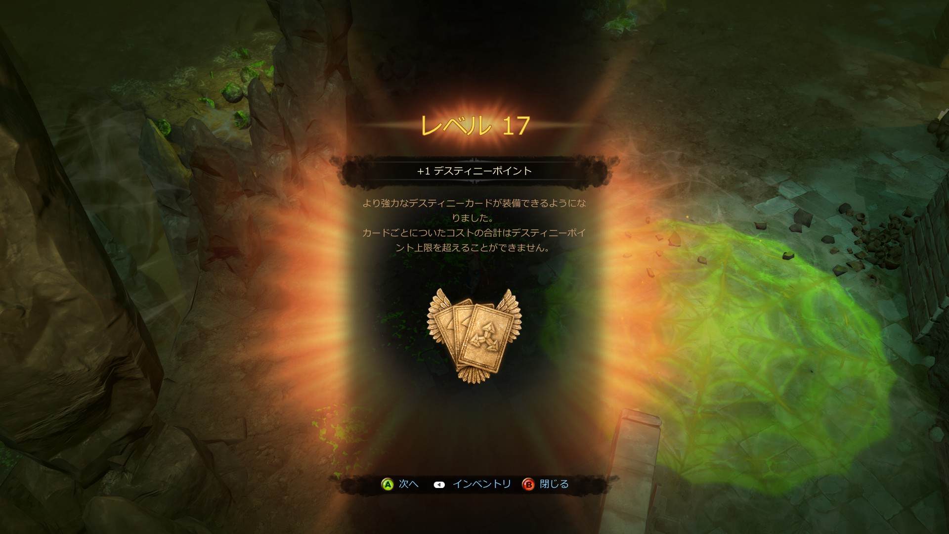 このくらいになると新要素も少ないしあんまり特筆することもないので簡潔に。 Lv.17~19 ヘルスとデスティニーポイントがそれぞれ上がります。 Lv.19では変成用のアイテム「パワーストーン」がもらえました。 Lv.20~23 カードスロットが増えるのは嬉しいですね。 どうもLv.20を超えてからレジェンドが出始めたような。 レベルで出現するアイテムが増える仕組みなのかな?